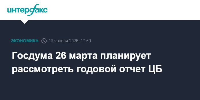 Москва. 19 января. INTERFAX.RU - Госдума на заседании 26 марта планирует рассмотреть годовой отчет Банка России за 2025 год, сообщил первый зампред председателя нижней палаты парламента Александр Жуков.