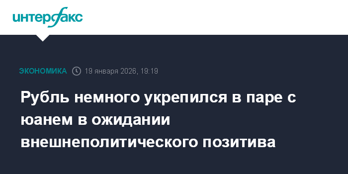 Москва. 19 января. INTERFAX.RU - Китайский юань опустился на Московской бирже по итогам торгов в понедельник, рубль подрос в ожидании внешнеполитического позитива. Курс китайской валюты в 19:00 мск составил 11,1425 руб., что на 2,65 копейки ниже уровня закрытия предыдущих торгов.