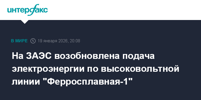 Москва. 19 января. INTERFAX.RU - Подача электроэнергии по высоковольтной линии "Ферросплавная-1" на Запорожской АЭС (ЗАЭС) возобновлена после ремонта, сообщил в понедельник глава госкорпорации "Росатом" Алексей Лихачев.