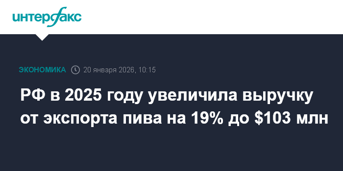 РФ в 2025 году увеличила выручку от экспорта пива на 19% до $103 млн