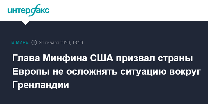 Москва. 20 января. INTERFAX.RU - Глава Минфина США Скотт Бессент призвал европейские страны не заниматься "эскалацией" ситуации вокруг Гренландии и не принимать ответных мер в виде торговых тарифов против Вашингтона, пишет во вторник Financial Times (FT).