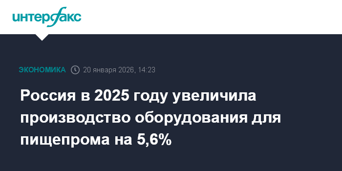 Москва. 20 января. INTERFAX.RU - В России в 2025 году производство оборудования для пищевой и перерабатывающей промышленности выросло на 5,6%, сообщил на конференции "Агротренды России - 2026" замначальника управления сельскохозяйственного, пищевого и строительно-дорожного машиностроения Минпромторга Илья Орсик.
