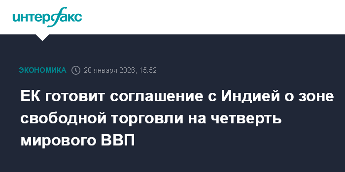 Москва. 20 января. INTERFAX.RU - Соглашение о свободной торговле Евросоюза с Индией обещает быть исторически беспрецедентным по охвату потребителей, заявила на Всемирном экономическом форуме в Давосе председатель Еврокомиссии Урсула фон дер Ляйен.