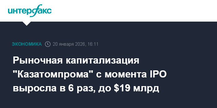 Москва. 20 января. INTERFAX.RU - Рыночная капитализация атомной компании "Казатомпром" с момента первичного публичного размещения акций (IPO) в 2018 году увеличилась более чем в шесть раз - с $3 млрд до $19 млрд, сообщила компания.