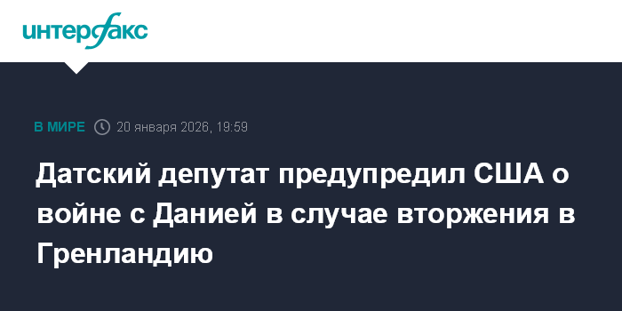 Москва. 20 января. INTERFAX.RU - Депутат парламента Дании Расумус Ярлов заявил, что если президент США Дональд Трамп вторгнется в Гренландию, то "это будет война, и мы будем воевать друг против друга".