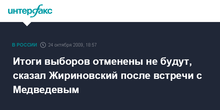 Барвиха. 24 октября. INTERFAX.RU - Президент РФ Дмитрий Медведев согласился с тем, что региональные выборы 11 октября прошли не идеально, но заявил, что их итоги отменены не будут, сообщил лидер ЛДПР Владимир Жириновский по итогам трехчасовой встречи лидеров парламентских фракций с главой государства.