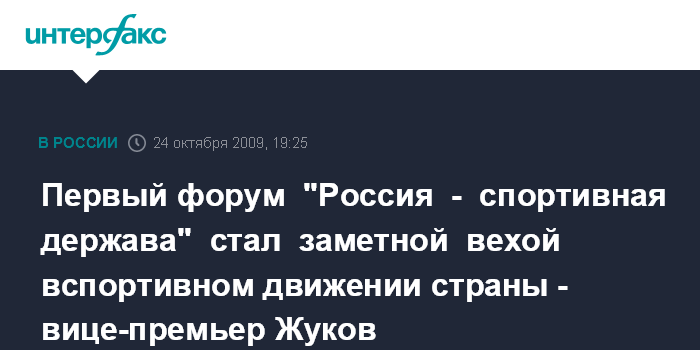 Казань. 24 октября. ИНТЕРФАКС-ПОВОЛЖЬЕ - Вице-премьер РФ Александр Жуков высоко оценил итоги прошедшего в Казани I всероссийского спортивного форума "Россия - спортивная держава". "Форум стал заметной вехой в спортивном движении России, нам удалось обсудить наиболее важные вопросы развития физкультуры и спорта, в том числе детско-юношеского, обменяться мнениями, передовым опытом и наметить пути решения чрезвычайно важных проблем", - сказал А.Жуков на заключительном заседании форума в субботу. "Планка форума, который отныне будет ежегодным, задана очень высокая, и ее нельзя опускать в будущем, настолько важны вопросы, которые на нем поднимаются", - сказал вице-премьер.