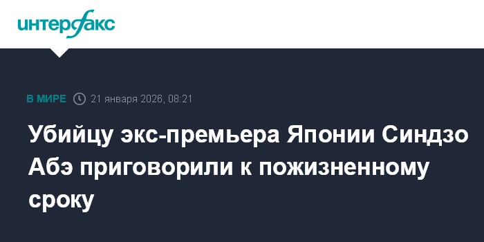 Москва. 21 января. INTERFAX.RU - Суд в Японии приговорил 45-летнего Тэцуя Ямагами к пожизненному заключению за убийство в 2022 году бывшего премьер-министра Синдзо Абэ, сообщают местные СМИ.