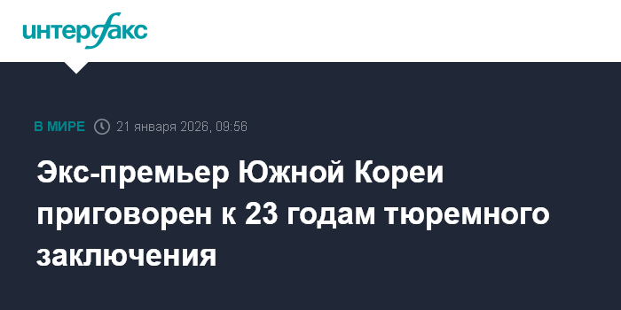 Москва. 21 января. INTERFAX.RU - Бывший премьер-министр Южной Кореи Хан Дук Су приговорен в среду к 23 годам тюремного заключения, он признан виновным в содействии введению военного положения - мере, к которой прибегнул экс-президент страны Юн Сок Ель в декабре 2024 года.