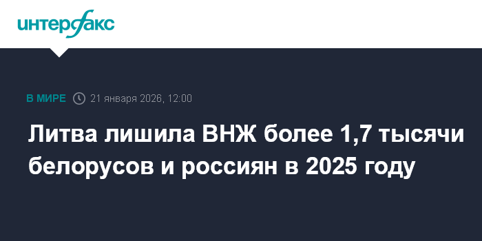 Москва. 21 января. INTERFAX.RU - В 2025 году в общей сложности 1721 гражданин Белоруссии и России был признан представляющим угрозу государственной безопасности и общественному порядку Литвы и получил отказ на вид на жительство в республике, сообщил в среду департамент миграции при литовском МВД.