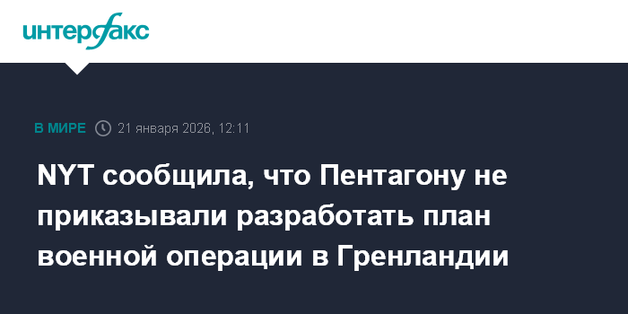 Москва. 21 января. INTERFAX.RU - Администрация США пока не направляла в министерство войны распоряжение готовить план военной операции в Гренландии - самоуправляемой территории Дании, сообщает в среду The New York Times со ссылкой на источники.