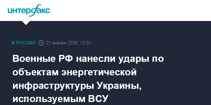 Москва. 21 января. INTERFAX.RU - Российская армия в течение суток нанесла удары по украинским энергетическим объектам, которые используются в интересах ВСУ, заявили в Минобороны РФ в среду.