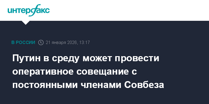 Москва. 21 января. INTERFAX.RU - Президент РФ Владимир Путин в среду вечером может провести уже второе на этой неделе оперативное совещание с постоянными членами Совета безопасности, сообщил его пресс-секретарь Дмитрий Песков.