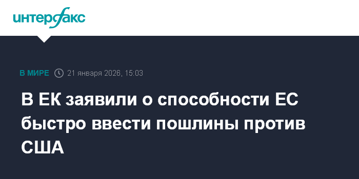 Москва. 21 января. INTERFAX.RU - Евросоюз при необходимости может в краткие сроки ввести пошлины на американские товары в ответ на пошлины США, которые должны вступить в силу в связи со спором сторон вокруг Гренландии, заявил изданию Financial Times (FT) член Еврокомиссии по экономике Валдис Домбровскис.