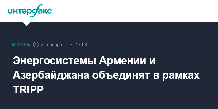 Москва. 21 января. INTERFAX.RU - Энергетические системы Армении и Азербайджана будут присоединены друг к другу в рамках проекта "Маршрут Трампа во имя международного мира и процветания" (Trump Route for International Peace and Prosperity, TRIPP), заявил на правительственном часе в парламенте премьер-министр Армении Никол Пашинян.
