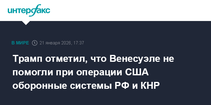 Москва. 21 января. INTERFAX.RU - Российские и китайские системы не помогли Венесуэле при операции американских военных в Венесуэле, заявил президент США Дональд Трамп в среду.