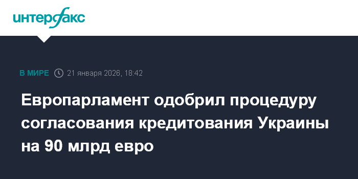 Москва. 21 января. INTERFAX.RU - Европарламент одобрил решение Совета ЕС о применении "процедуры расширенного сотрудничества" для предоставления Украине кредита в размере 90 млрд евро на 2026-2027 годы.