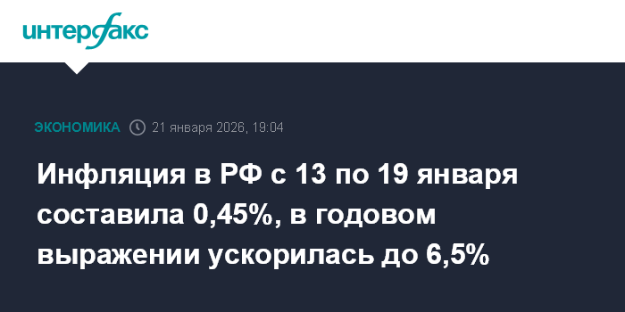 Москва. 21 января. INTERFAX.RU - Инфляция в РФ с 13 по 19 января 2026 года составила 0,45% после 1,26% с 1 по 12 января (из-за праздников получился почти в два раза более длинный отрезок времени, чем обычный недельный), сообщил в среду Росстат.