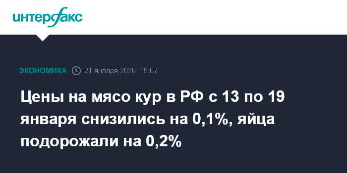 Цены на мясо кур в РФ с 13 по 19 января снизились на 0,1%, яйца подорожали на 0,2%