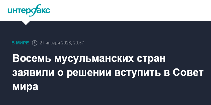 Москва. 21 января. INTERFAX.RU - Группа из восьми мусульманских стран подтвердила намерение вступить в Совет мира по сектору Газа по приглашению президента США Дональда Трампа, говорится в совместном заявлении, опубликованном на сайте МИД Катара в среду.