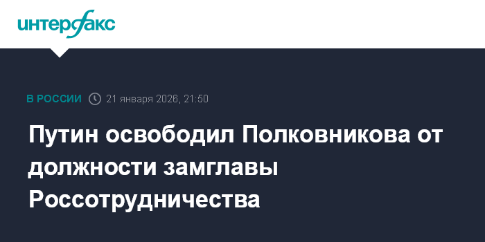 Москва. 21 января. INTERFAX.RU - Алексей Полковников указом президента РФ освобожден от должности заместителя руководителя Федерального агентства по делам Содружества Независимых Государств, соотечественников, проживающих за рубежом, и по международному гуманитарному сотрудничеству.