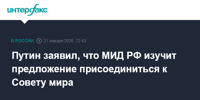Москва. 21 января. INTERFAX.RU - МИД РФ изучит документы по приглашению России в "Совет мира", проконсультируется со стратегическими партнерами и после этого даст ответ США, заявил президент РФ Владимир Путин.
