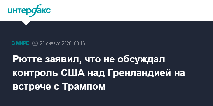 Москва. 22 января. INTERFAX.RU - Генеральный секретарь НАТО Марк Рютте заявил, что не обсуждал возможный контроль Вашингтона над Гренландией на встрече с президентом США Дональдом Трампом, а главной темой дискуссии стала безопасность в арктическом регионе.
