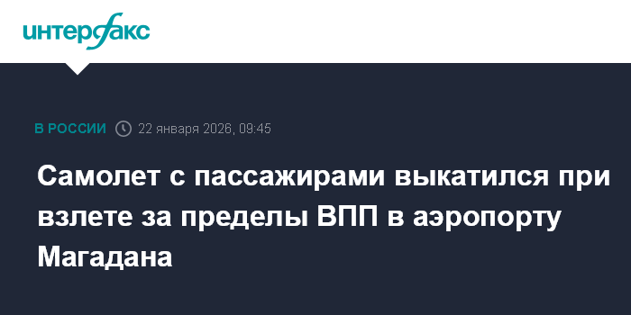 Москва. 22 января. INTERFAX.RU - Самолет выкатился за пределы взлетно-посадочной полосы при попытке вылета из аэропорта Магадана, пострадавших нет, сообщила Дальневосточная транспортная прокуратура.