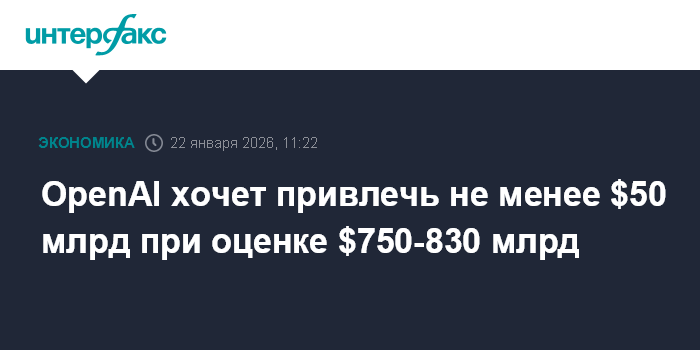 Москва. 22 января. INTERFAX.RU - Американская ИИ-компания OpenAI хочет привлечь не менее $50 млрд в рамках инвестраунда с оценкой $750-830 млрд, сообщает Bloomberg со ссылкой на источники.