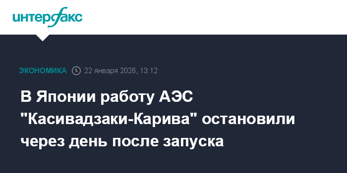 Москва. 22 января. INTERFAX.RU - Tokyo Electric Power (TEPCO) после срабатывания сигнализации остановила работу перезапущенного накануне реактора № 6 крупнейшей в мире АЭС "Касивадзаки-Карива", передает Kyodo News со ссылкой на заявление компании.