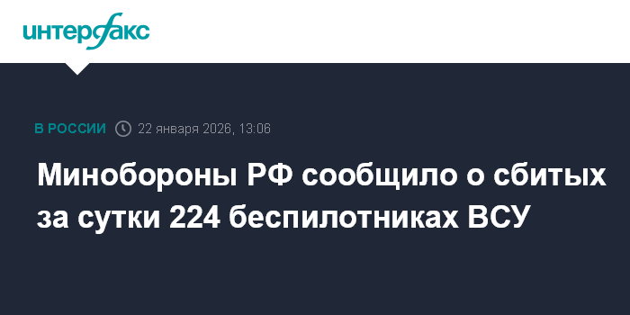Москва. 22 января. INTERFAX.RU -Российские военнослужащие в течение суток сбили четыре снаряда HIMARS и 224 украинских беспилотника, заявили в Минобороны России в четверг.
