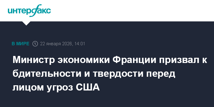 Москва. 22 января. INTERFAX.RU - Отказ президента США Дональда Трампа от дополнительных пошлин для ряда стран ЕС из-за Гренландии - это первый хороший знак, но Европа должна сохранять бдительность, заявил RTL министр экономики и финансов Франции Ролан Лескюр.