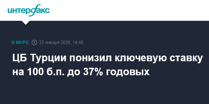 Москва. 22 января. INTERFAX.RU - Центробанк Турции понизил ключевую процентную ставку семидневных операций РЕПО на 100 базисных пунктов, до 37% годовых, по итогам заседания в четверг.
