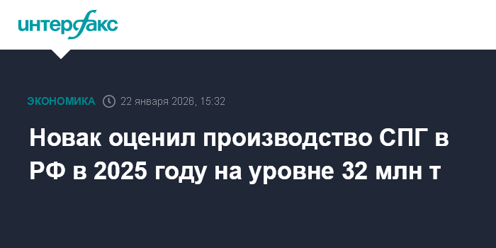Москва. 22 января. INTERFAX.RU - Производство сжиженного природного газа в России в 2025 году составило "порядка 32 млн тонн" – такую оценку привел заместитель председателя правительства РФ Александр Новак в авторской колонке для журнала "Энергетическая политика".
