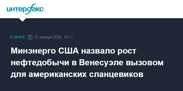 Москва. 22 января. INTERFAX.RU - Увеличение добычи нефти в Венесуэле и возможное последующее снижение цен, конечно, станут вызовом для производителей сланцевой нефти в США, но, во-первых, не нужно их недооценивать, а во-вторых, низкая цена - это хорошо для потребителей и для роста спроса, заявил американский министр энергетики Крис Райт в интервью Bloomberg TV.