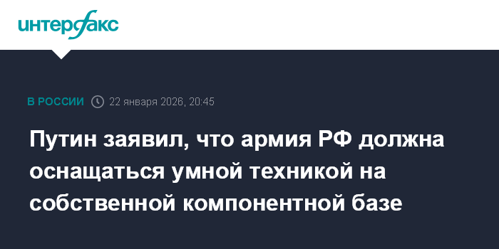 Москва. 22 января. INTERFAX.RU - Российская армия должна оснащаться умной техникой на базе отечественных решений, заявил президент РФ Владимир Путин.