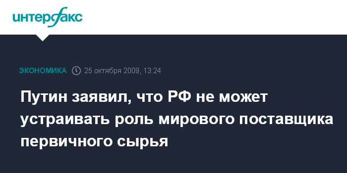 Санкт-Петербург. 25 октября. INTERFAX.RU - Россия не смирится с ролью мирового поставщика первичного сырья, заявил премьер-министр РФ Владимир Путин. "Россию, как и любую другую страну, не может устраивать роль поставщика на мировой рынок главным образом первичного сырья. Это касается любого сырья - углеводородов, биоресурсов или древесины", - сказал В.Путин, выступая на третьем российско-финляндском Лесном саммите в Петербурге в воскресенье. Он подчеркнул, что "Россия как и любая другая страна заинтересована в максимально эффективном использовании своих природных богатств".