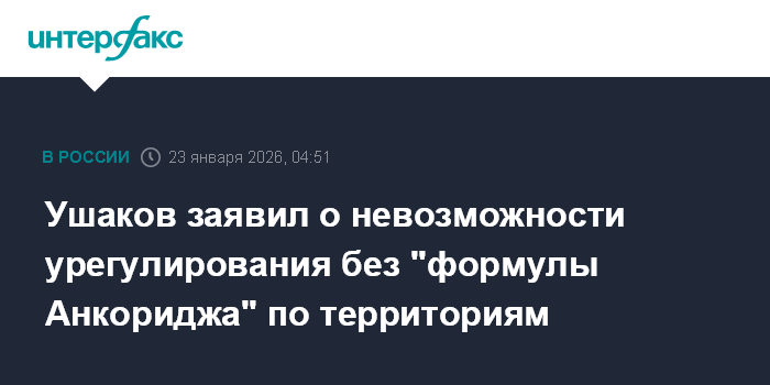 Москва. 23 января. INTERFAX.RU - В ходе переговоров президента РФ Владимира Путина с американской делегацией было вновь констатировано, что без решения территориального вопроса "по формуле Анкориджа" рассчитывать на долгосрочное урегулирование на Украине не стоит, заявил помощник главы российского государства Юрий Ушаков.