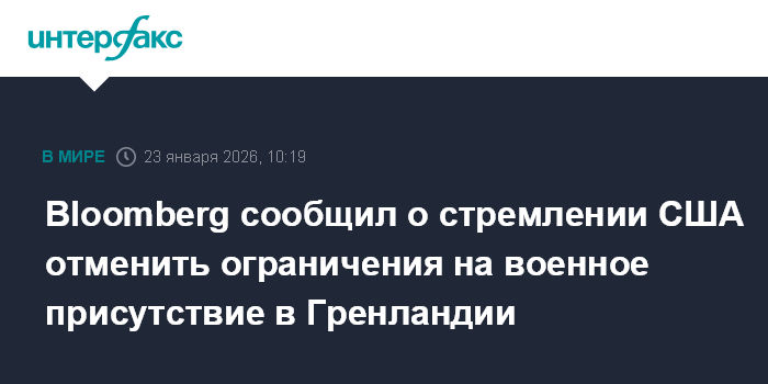 Москва. 23 января. INTERFAX.RU - США хотели бы внести изменить соглашение с Данией об обороне, чтобы исключить любые ограничения на американское военное присутствие в Гренландии, сообщает Bloomberg со ссылкой на источники, знакомые с ситуацией.