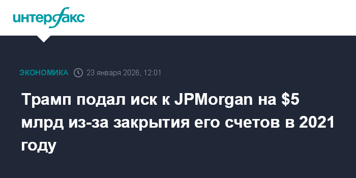 Москва. 23 января. INTERFAX.RU - Президент США Дональд Трамп подал в суд иск к JPMorgan Chase & Co. и его главному исполнительному директору Джейми Даймону, которых он обвиняет в несправедливом закрытии его банковских счетов по политическим причинам. Трамп требует $5 млрд компенсации.