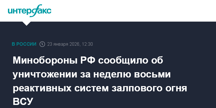 Москва. 23 января. INTERFAX.RU - Российские военные за неделю в зоне специальной военной операции уничтожили восемь боевых машин реактивных систем залпового огня ВСУ, сообщили в Минобороны РФ в пятницу.