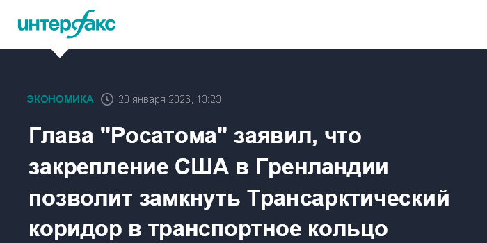 Москва. 23 января. INTERFAX.RU - Трансарктический транспортный коридор в случае закрепления США в Гренландии и сотрудничества с Россией может замкнуться и превратиться в большое транспортное кольцо, считает глава "Росатома" Алексей Лихачев.