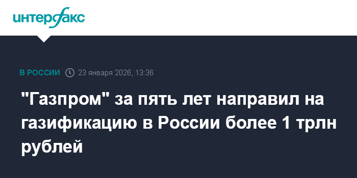 Москва. 23 января. INTERFAX.RU - "Газпром" с 2021 по 2025 год направил на газификацию в России более одного триллиона рублей, сообщил вице-премьер Александр Новак на заседании федерального штаба по газификации. ОБ этом сообщает "Россия 24".