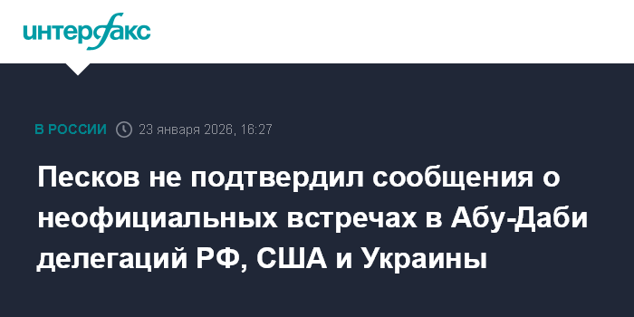 Москва. 23 января. INTERFAX.RU - Пресс-секретарь президента РФ Дмитрий Песков не подтвердил сообщения СМИ, согласно которым в данный момент в Абу-Даби проходят неофициальные встречи между делегациями России, США и Украины.