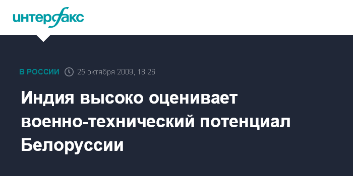 Минск. 25 октября. INTERFAX.RU - Госминистр по вопросам обороны Индии Палам Раджу в ходе переговоров министром обороны Белоруссии Леонидом Мальцевым в воскресенье в Минске отметил успешное продвижение наработок двух стран в военно-технической области. "Индия и Белоруссия разделяют точку зрения в международной политической сфере. Растущая дружба еще более сблизит наши страны. Индия высоко оценивает технологические возможности в военной сфере, которые есть в распоряжении Белоруссии", - сказал П.Раджу.
