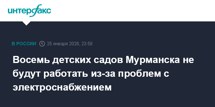 Москва. 25 января. INTERFAX.RU - Восемь детских садов в Ленинском и Октябрьском округах Мурманска, где с 23 января перебои с электроснабжением, в понедельник не будут работать, сообщил глава города Иван Лебедев.
