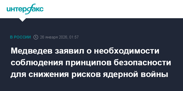 Москва. 26 января. INTERFAX.RU - Снижение рисков ядерной войны будет гарантировано только при встречном и системном соблюдении принципов ядерными державами, контроль над вооружениями выполняет второстепенную функцию, заявил зампред Совбеза России Дмитрий Медведев.