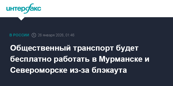 Москва. 26 января. INTERFAX.RU - Проезд в общественном транспорте в Мурманске, ЗАТО Североморске и между ними будет бесплатным до восстановления электроснабжения этих городов, сообщил губернатор Мурманской области Андрей Чибис по итогам заседания оперштаба.