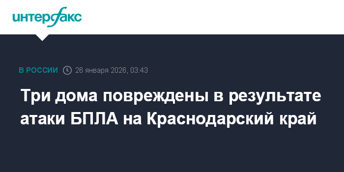 Москва. 26 января. INTERFAX.RU - Три дома в Славянске-на-Кубани получили повреждения в результате падения обломков БПЛА, сообщили в оперативном штабе по региону.
