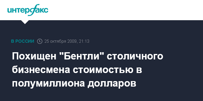 Москва. 25 октября. ИНТЕРФАКС-МОСКВА - В Москве под угрозой оружия похищен "Бентли Континенталь" стоимость полмиллиона долларов.